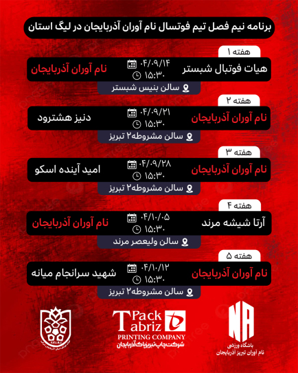 مؤسسه ورزشی نامآوران آذربایجان متعهد به تشکیل تیمهایی حرفهای در رشتههای فوتسال، فوتبال، بدنسازی، شنا و سایر ورزشها است. هدف ما توسعه تیمهای ردهبالا در تمامی رشتههای منتخب، با بهرهگیری از مربیان متخصص، امکانات مدرن و متدهای بهروز است. ما تمرکز خود را بر ارائهٔ ساختار حرفهای باشگاهی، تمرینات تخصصی و حضور در رقابتهای قوی منطقهای، کشوری و فراتر از آن گذاشتهایم.